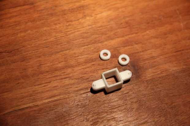 Una vez el cojinete puede colocar el tubo de fibra de carbono de 50mm sobre los cojinetes y fijarla con una tuerca y una arandela en un lado y una, 3D impreso separador y la tuerca en el otro lado. Las arandelas deben apretar las tuercas en el lado externo de cada cojinete no en la longitud de 50mm de fibra de carbono. Esto permitirá que la fibra de carbono giren libremente sobre el cojinete.