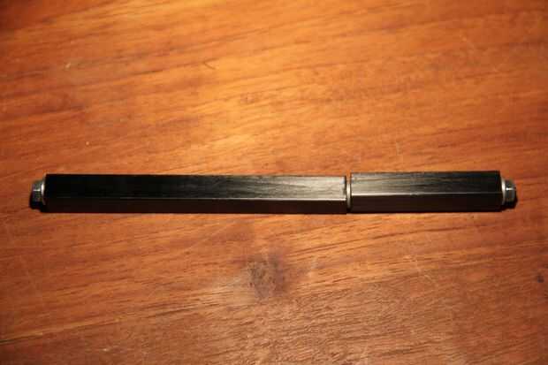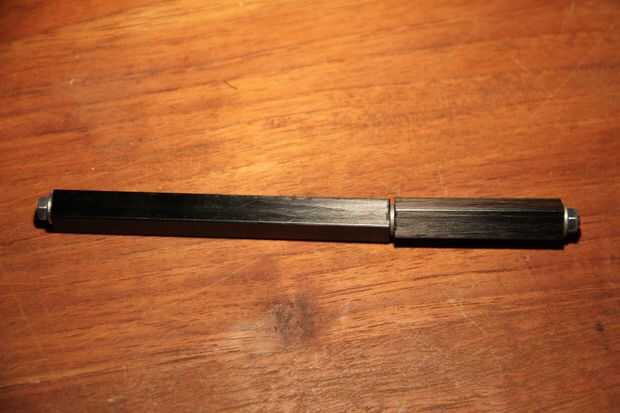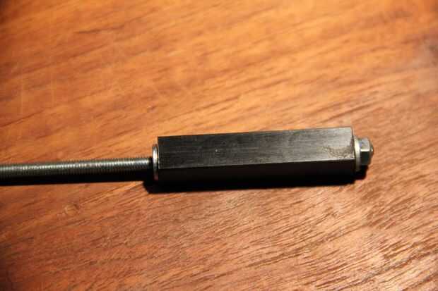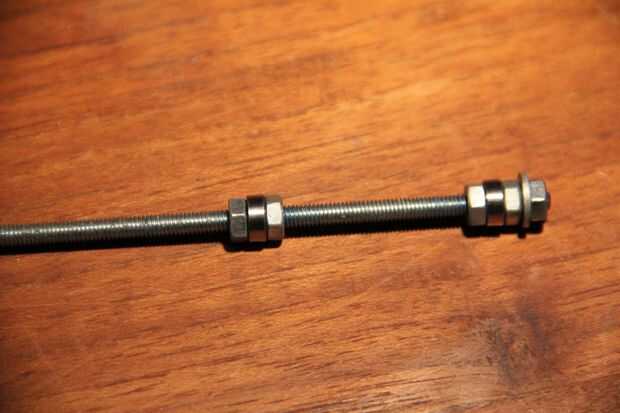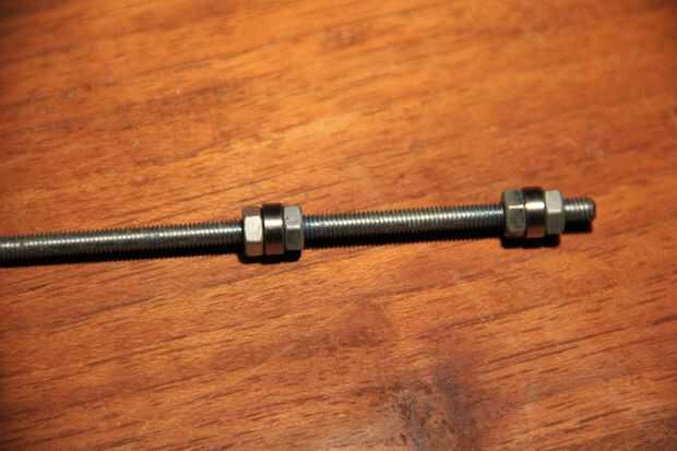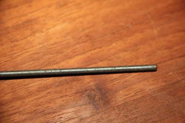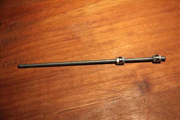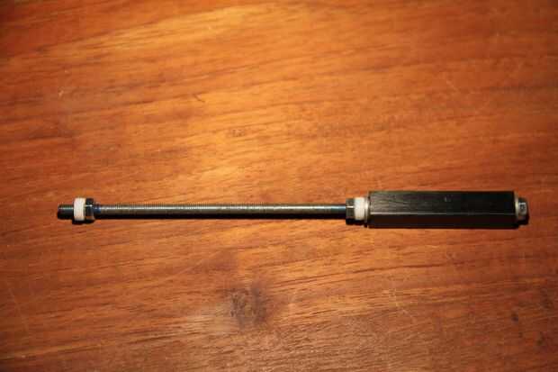 Para preparar el tubo de cola es un poco más complicado que los brazos de lado. Primero tomé mi varilla roscada M4 y corte una pieza de 160mm de largo (150mm para la fibra de carbono y un poco extra para las tuercas y arandelas en cada extremo).
