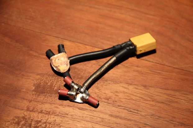 Tres conectores de bala femenino luego eran soldados directamente a cada pieza de cobre (para un tri más grande, puede usarse alambre entre el cobre y las balas pero no necesitamos) así como dos longitudes pequeñas de turnigy silicón puro alambre (como se explica antes de usar negro translúcido en lugar de rojo para mi alambre caliente para mantener todo negro) que se puede y luego soldar un conector XT60 (o cualquier conector se enchufa directamente en la batería). Asegúrese de que usted soldar el conector de la manera correcta. En este punto también se pueden soldar dos Jerseyes de mujer a las piezas de cobre para conectar posteriormente a la KK2 para que pueda leer el voltaje de las baterías más en por la pista. Colocar heatshirink sobre todo balas así como una cantidad abundante de cada pieza de cobre (que realmente no quieres nada corto aquí porque ser directamente cortocircuitar la batería). Usé alambre eléctrico para evitar el cortocircuito cobre como me resultó difícil aplicar el encogimiento de calor correctamente con todos los salientes.
