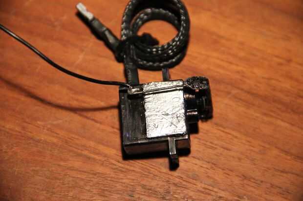 Ahora podemos soldar el cable negro del soporte de batería del AAA para el clip. Después el siguiente paso, deberemos conectar los dos hilos de los extremos de las bujías a los pads con cinta (Asegúrese de que la cinta no se en el camino donde el clip hará contacto con las pastillas).