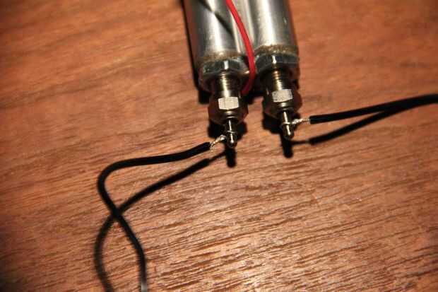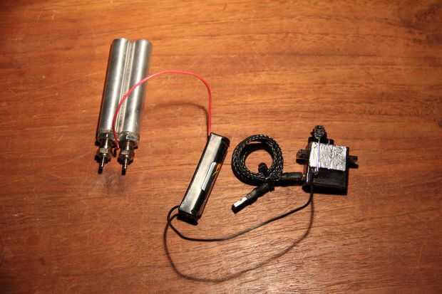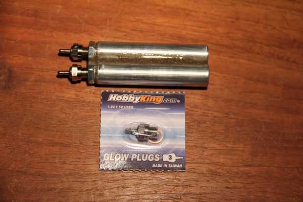 Como se puede ver, la r puede ser atornillado en las tuercas. Una energía de receptores de enchufe de resplandor de su cosita de cola y de las roscas. El cable rojo (o negro, son intercambiables para este propósito debido a la construcción de las bujías) tiene que hacer contacto con ambos hilos bujías para ello hacemos una conexión eléctrica entre dos tuercas de 1/4 (solo lo hice con la mitad de otra tuerca soldada a dos tuercas de 1/4) y entonces nos podemos soldar el cable rojo del soporte de la batería a cualquier parte de la Asamblea de la tuerca (sólo soldado lo a mi conexión a mantener todo simétrico). que terminó sustituyendo la conexión sólida de la batería a las tuercas con una conexión de puente de macho y hembra para hacer el montaje de barril todo desmontable para fácil carga. Como se puede ver, la batería ahora debe conectar tanto el clip en el servo y las tuercas en el barril.