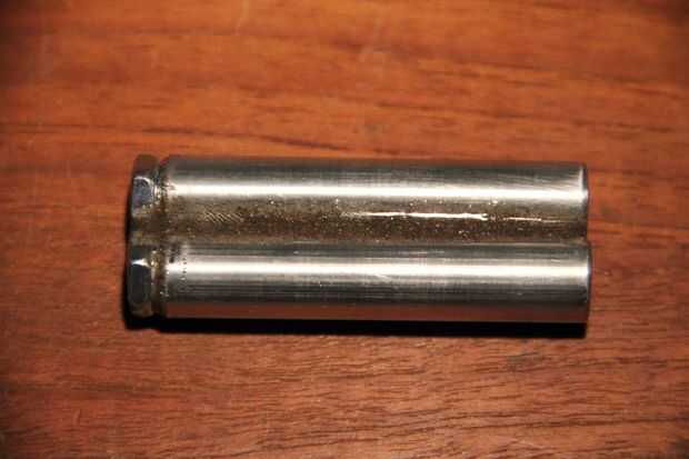Para preparar el tirador de bola de fuego primero tomamos dos 50-100mm (mina son 65mm) longitudes de tubo de aluminio de 12mm. Entonces les había lijado con papel de lija de grano 100 a 600 en preparación para el pulido. Uno de los extremos de cada tubo fue redondeado dentro y por fuera con los archivos de la aguja para evitar cortes al cargar (y para que se vea un poco mejor). Luego tomó dos 1/4 x 28 tuercas y presentado la parte superior de ellos con el fin de llegar a y quitar el anillo de nylon porque (como veis en la foto) se funde por el calor (si se encuentra normal 1/4 x 28 tuercas de de que los justo sobre el tubo epoxy pero las normales sólo que pude encontrar fueron tan caros como las contratuercas 10 x). Entonces ajustaron las tuercas a los extremos del tubo así como epoxying los dos tubos a sí mismos. Mezclé algunas virutas de metal con el epóxido a se mezclan con el aluminio (virutas habría mezclado más virutas de acero oxidados). Las virutas de hacerlo un poco más difícil trabajar con el epoxi por lo que recomiendo mezclarla después de fondo han mezclado las piezas A y B.