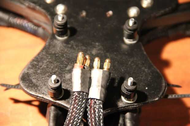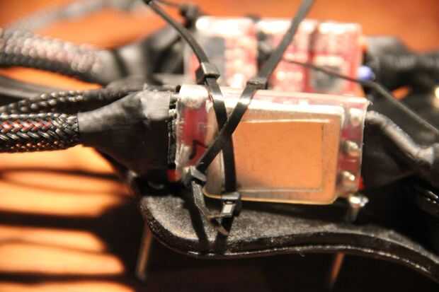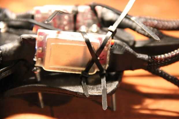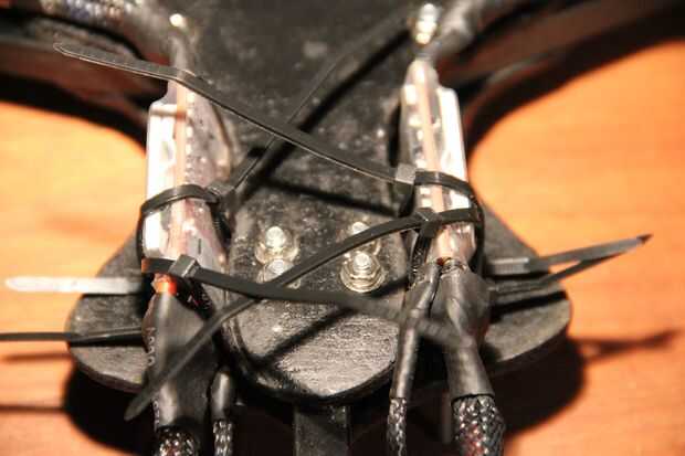 El ESC puede pasar a través de los lazos del cierre relámpago. Como se entrecruzan los lazos zip primero la ESC es realmente realmente realmente seguras en esta configuración. Los extremos de la ESC que se conectan a los motores orientadas hacia los brazos de lado y en este punto se pueden doblar ligeramente hacia fuera. Los extremos que se conectan a la batería se pueden pasar por detrás del marco de la preparación para conexión a nuestro arnés Y personalizado