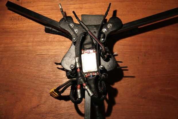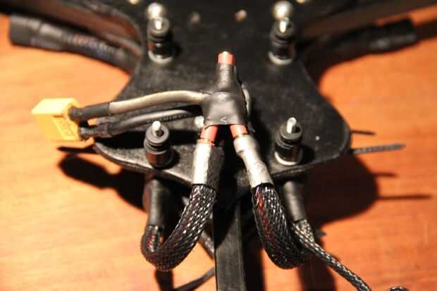 La salida de dos laterales puede conectarse ahora a nuestro arnés Y (Asegúrese de que el CSE no es está conectado al revés). Los cables de señal de cada lado ESC ahora también se pueden pasar alrededor de la parte posterior del marco y entre los cuatro postes que descanse en la KK2. La ferrita anillos deben sentar hacia fuera la parte posterior de la KK2 mientras que los extremos del cable deben sobresalir el extremo delantero del tri, esto mantendrá todo lo limpias y apretadas en un accidente o sólo a través de un uso normal. La parte trasera ESC entonces se coloca en el centro de la KK2 entradas con las salidas que sobresale de la parte posterior y los cables de batería envuelven alrededor de a hacia el la parte trasera que puede conectarlos al arnés Y así. El cable de señal de la parte posterior que ESC se coloca de tal manera que el anillo de ferrita también se mantiene seguro al lado de la Junta KK2 con los extremos pegando en la parte delantera a lo largo de lado los extremos de los cables de servo de dos laterales.