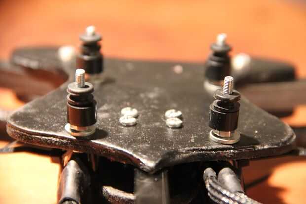 Los postes para la KK2 a montarse se configuran con espaciadores para mantener la KK2 tan elevados como sea posible (por lo que podemos encajar nuestra basura por debajo de ella). Personalmente utilicé una Arandela gruesa, tuerca M3, espaciador de Mecano y un ojal de goma para la Junta a la altura correcta. En cualquier caso, un ojal de goma es imprescindible para evitar las vibraciones atornillar con la KK2. La KK2 debe montarse con los botones en la espalda y la flecha blanca grande hacia el frente de la tricopter. Tenga cuidado de no poner su KK2 demasiado alto si no no claro las hélices