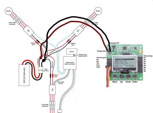 La imagen de arriba no es mio, robaron de este hilo. Como tal tiene un problema. Lo positivo y negativo de debe de la ESC frente dos ser conectado al controlador de vuelo mientras el positivo y negativo de la parte posterior ESC a la FC no debe conectarse a la FC.