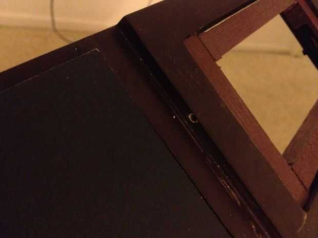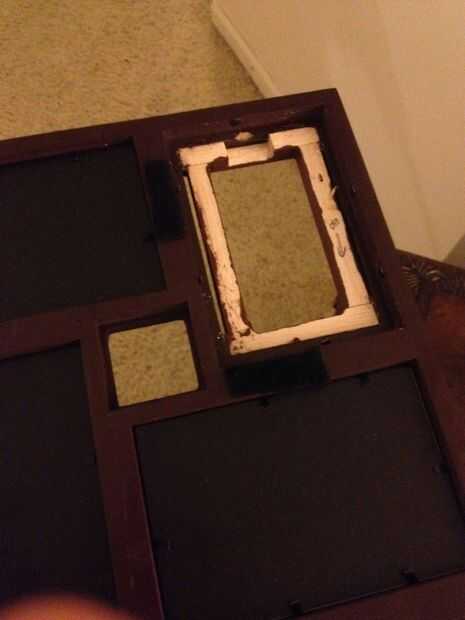 Un taladro que se alinee con el botón de encendido y cortar un pequeño clavo con pinzas por lo que todavía se puede acceder al botón de encendido. Glue marco de cuadro para asegurar con pegamento caliente.