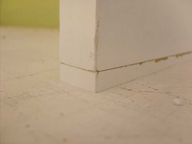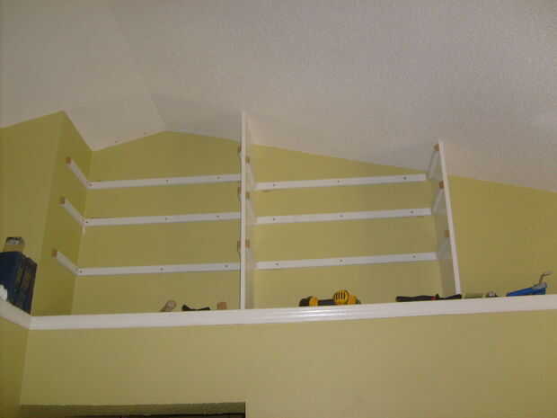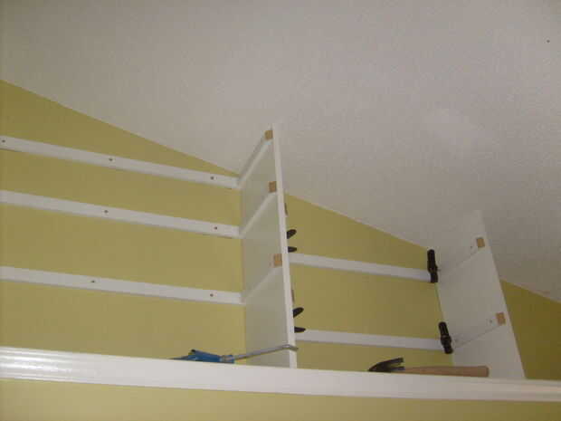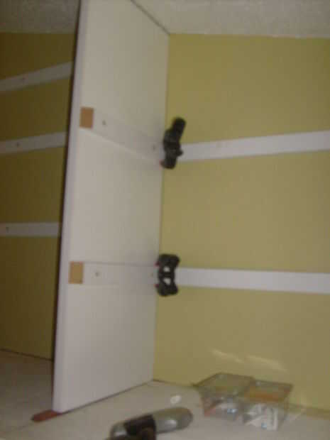 Para instalar los divisores puede tomar un poco de paciencia. Asegúrese de que usted vuelva y alineados con las marcas de ajuste seco (o no caben sus estantes) y los divisores en lugar. Poner una capa fina de adhesivo de construcción en el borde posterior del divisor, donde se conoce a la pared y utilice cuñas para obtener los divisores para sentarse perfectamente vertical. Esto es importante para que sus estantes no cuesta de adelante hacia atrás.