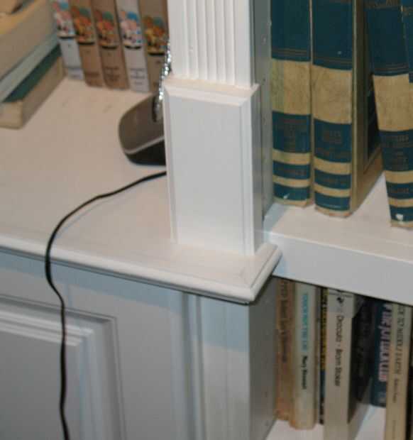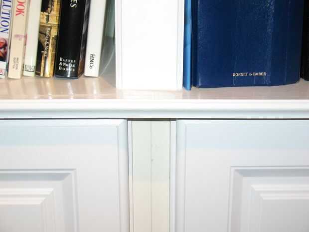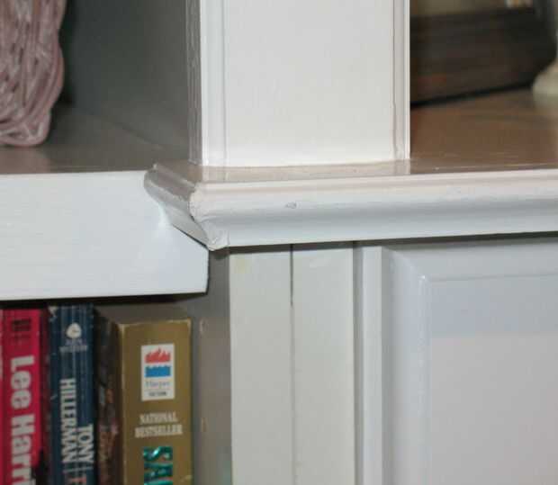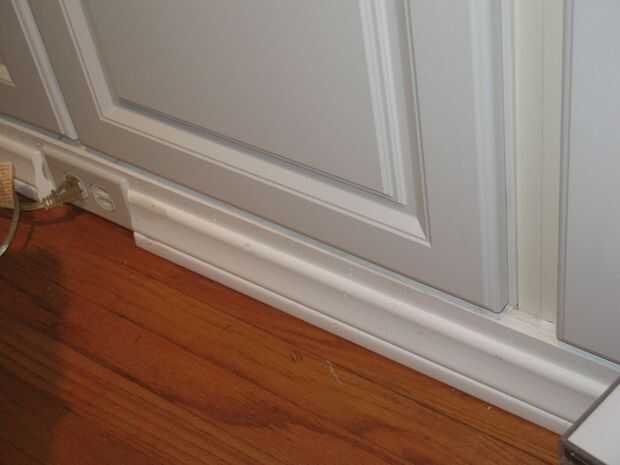 El zócalo es Pino 1 "x 3" y el moldeado de la cara superior es demasiado. Cada uno está conectado con un 1/4" revelan desde los estantes superior e inferior. La placa base no es necesario que toque el suelo (pero puede) ya que agregamos calzado moldeado sobre la cara.