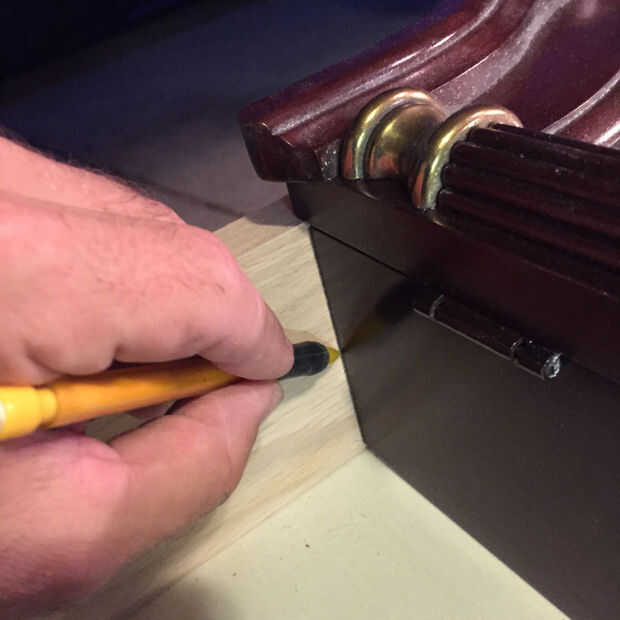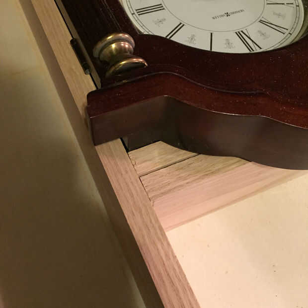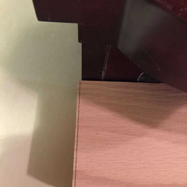 La primera imagen me muestra la longitud de la parte superior y parte inferior de mi caja de la marca. Sistema mi tablero incluso con un lado del reloj y ponga una marca de lápiz en el otro borde. Si la pieza superior e inferior simplemente orgullosa de la marca del reloj debería ajustar perfectamente en el interior. La segunda foto muestra la pieza superior e inferior, corte un poco orgullosa de mi línea y el reloj.