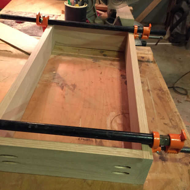 Plantilla de bolsillo parece ser el camino a seguir para mi caja. Es rápido, fácil y seguro. Puesto que no pegue nada, sin necesidad de esperar para un pegamento se seque. Si haces un montón de madera recomiendo uno. Me gusta usar abrazaderas para mantener cosas cuadrado cuando instale los tornillos de agujero de bolsillo.