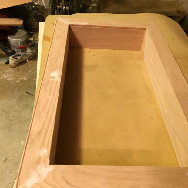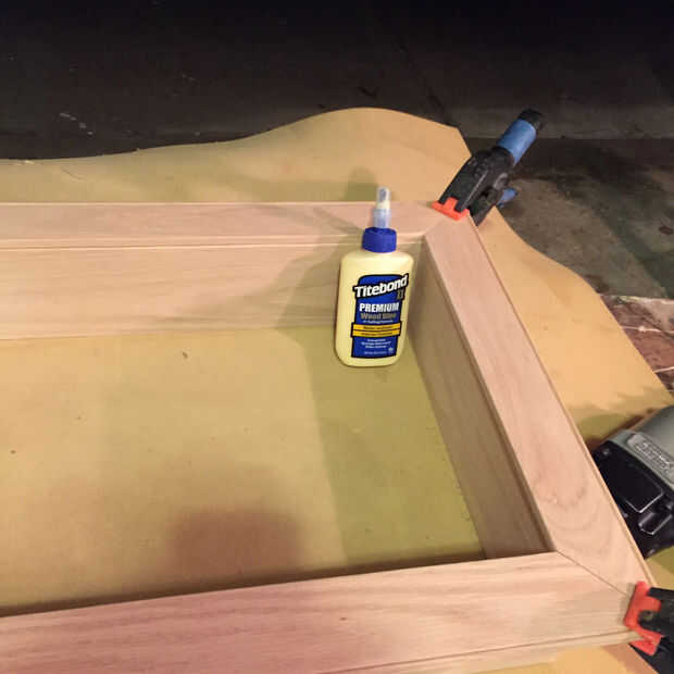 Puesto que el marco se va a celebrar la caja y mi reloj, en su lugar decidí pegar y fijar el marco a la caja. Antes de el pegamento que usé algunas abrazaderas de resorte para mantener unida a la estructura en los 4 lados. El diseño se veía bien para pegar el marco a la caja - y poner unos clavos de acabado para mantener todo juntos mientras el pegamento seca. última foto muestra el marco pegado, con los agujeros del clavo de acabado en.