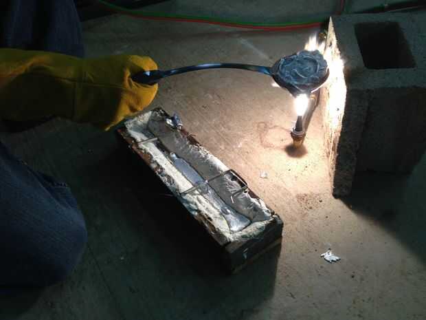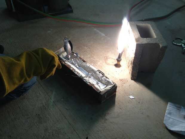 Esto era más complicado entonces pensé que sería. Mi antorcha de gas de mapp funde aluminio gran pero la cantidad de aluminio que debe ser líquido era una cantidad mayor que mi antorcha podría mantener a esa temperatura. Por suerte mi papá tiene un soplete oxi-acetyline. Suspender la barra de acero en el molde con alambre fino. Fundir el aluminio, necesita casi resplandor, luego Vierta en el molde y deje enfriar durante una hora. Una vez frío retirar del molde.