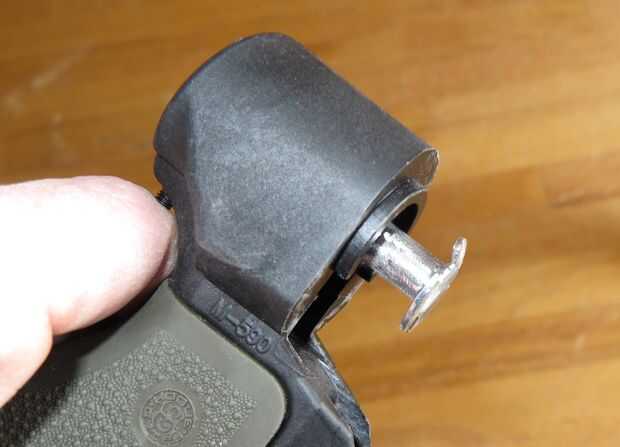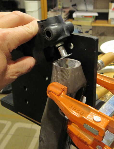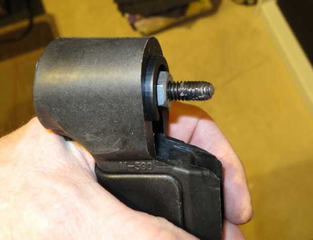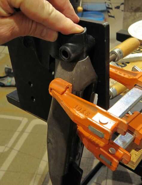 - Monte la tuerca tee a la empuñadura con el perno de montaje. Asegúrese que la tuerca de t es suficiente para permitir el agarre asentar completamente contra la parte delantera de la culata corta - no quiere averiguar que no se ajusta una vez que el stock está lleno de resina epoxi y cristal.
