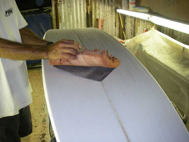 Ahora es tiempo de "pantalla" de la Junta. Johnny utiliza una hoja de lija pantalla de panel de yeso. grano 80 o 120 granos. No importa que. Él ha estado utilizando la misma pieza de la pantalla durante quince años. No es eliminar mucho material. Utiliza una almohadilla de un trozo de espuma aislante para presionar en la pantalla. La almohadilla tiene barras longitudinalmente en la parte inferior para que sea más flexible en un eje que la otra. Le permite ajustarse a las curvas mejor.