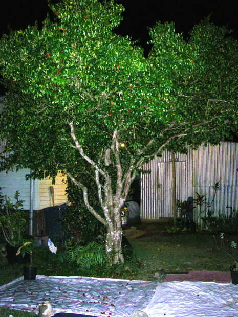 Johnny tiene un árbol de cerezo de Surinam en su patio. Los frutos parecen calabazas rojo pequeño. Son muy sabrosas como cerezas. Aquí está cómo cosechan, acaba de poner unas hojas en el árbol y dejar que descarga de cerezas en ellos. Dice "si yo no rastrillo les cada día es como caminar a través de un montón de ruido de fondo. Y usted no puede matar a estas cosas. ¿Quieres algunos plantones? Aquí le damos un centenar de ellos." Señala un brotes de árbol forestal de surinam cherry brotación bajo el árbol.