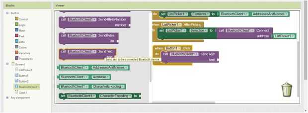 "Bloques" a "Screen1" a "BluetoothClient1" de arrastre "llamada BluetoothClient1. Texto SendText "en"espectador".