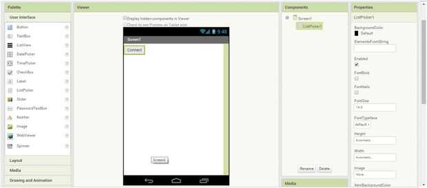 En la barra de "Propiedades", cambiar el nombre de este "ListPicker1" a "Conectar".
