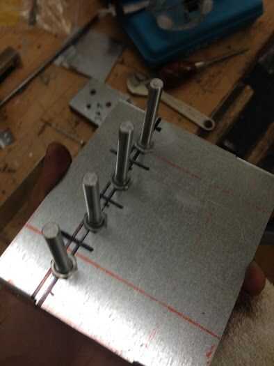 Entonces hago un agujero minúsculo por encima del primer agujero de potenciómetro, para mi interruptor. Yo utilice una broca de 3/32 para éste, medido y marcado con un cuchillo y la lezna. Asegúrese de que el interruptor no está tocando la base de cualquier potenciómetro!