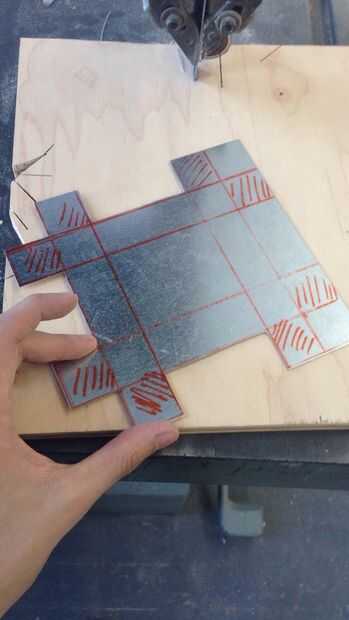 Ahora utilizamos el metal Sierra de cinta y el cortador de la hoja para cortar la pieza superior. Una plaza de 4 "x 4,5" con 2, 1 "x 1" lengüetas de la parte 4". Finalmente doblar estos y fije a las paredes laterales.
