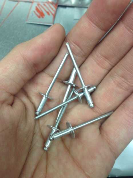 Así que la tercera imagen es utilizando el punzón para marcar mis agujeros correspondientes, pero un sharpie funcionaría así. Yo también uso la Plaza ingeniería para mantener los soportes al ras del borde. Ahora que los agujeros han sido perforados, usar los remaches 8 de pulgada para trabarlo en su lugar. Si no has usado una pistola de remache antes de practicar en un pedazo.