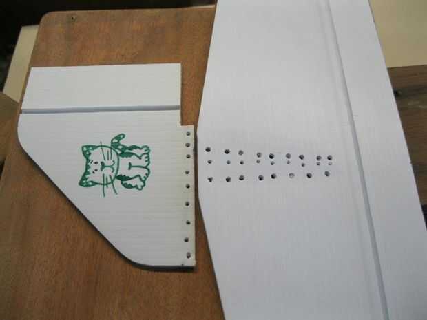 Usé el Coroplast para la cola. Corte cuidadosamente a un lado de un solo distribuidor y tiene una bisagra de brecha menos instantánea. Es un material muy resbaladizo por lo taladré agujeros donde va pegado al plano para que el epoxi de 5 minutos se completa y en mejor.