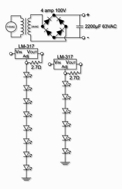 Cómo montar estos fue mi siguiente pensamiento. Surgió con el uso de 1.5" de ángulo de aluminio que también actuaría como un disipador de calor. Hay muchos IC diseñado para coche LED y LED cuerdas con convertidores boost etc. pero me fui de la vieja escuela. LED blancos tienen un voltaje caiga a través de ellas de aproximadamente 3,5 voltios. Si pongo 8 de los de serie necesito 28 voltios. Esto funcionó para lo que iba a utilizar como una fuente de alimentación. Tuve varios transformadores de 24 VCA de otros proyectos inacabados que podrían abastecer 2 amperios y quería ser capaz de usar estas. También están disponibles. Uno de ellos podría funcionar 3 secuencias de 8 LED con un margen de seguridad. Echale 1 esquemático, porque 24 VAC es que un valor RMS el valor pico del voltaje es 1,4 veces mayor. Después de la rectificación y carga un condensador de filtro que está tan alrededor 35VDC disponible en ninguna carga. Bajo carga de aproximadamente 1,5 amperios nos bajan hasta unos 30 voltios. Lo planeado en el uso de un regulador de corriente simple basado en el LM317. Son bien sabido, sólido, puede suministrar 1,5 amperios y, no son caros. Porque el LED que tuve no fueron montado en un tablero de "estrella" de PC tuve que aquellos de origen y averiguar cómo soldarlos a las juntas. La siguiente es mi experiencia con todo esto con un muy buen resultado. Puede utilizar tanto de esto como usted necesita construir su propio sistema de iluminación LED. Vamos a comenzar a construir!