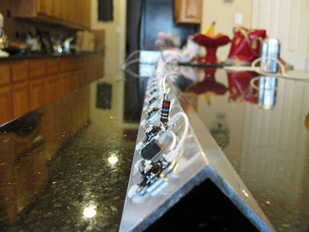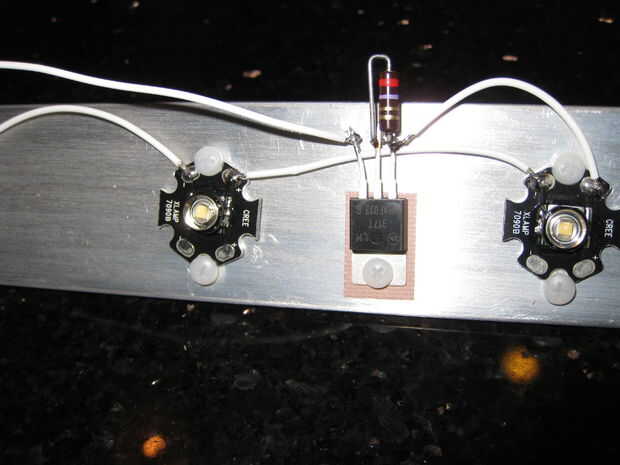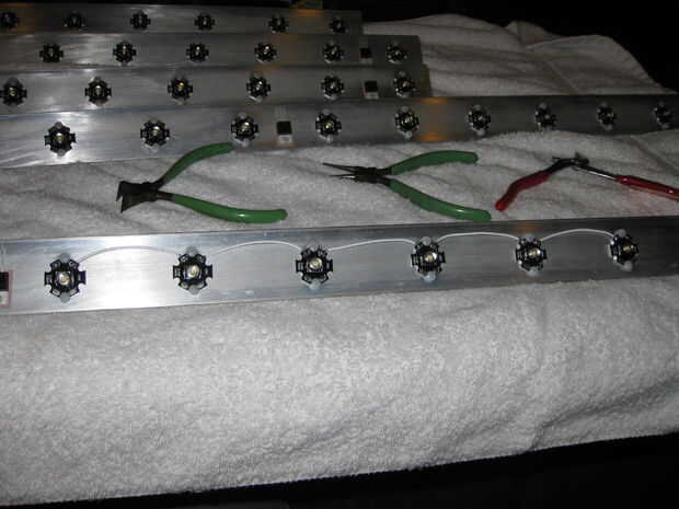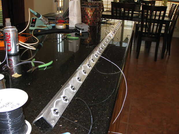 Usé alambre de calibre 22 y había conectado el LED en serie en las secciones de ocho. Para mis dos secciones de cinco pies que tenía la situación de tres pie pieza y una pieza de dos pies. Esto me dejó con tener dos LED para una cadena en una sola pieza de aluminio y los otros seis en el otro. Esto significó que necesitaba para conectar la cadena después de que les montara. Me encanta la soldadura bajo contadores y boca abajo.