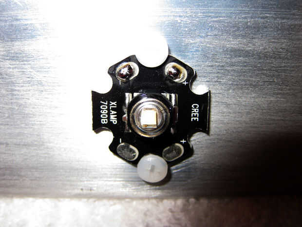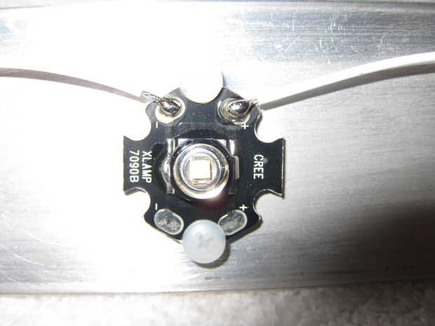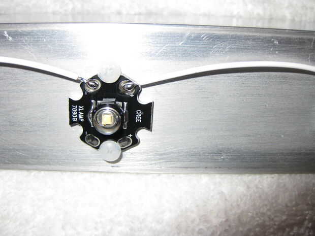 Primer paso aquí es soldar una pequeña gota sobre el + y = terminales en la placa de la estrella. Esto es un poco más difícil de lo que piensa y subir la temperatura en el soldador ayuda mucho. Entonces cada cable de la lata y con una punta limpia, ponga una pequeña soldadura en la punta y presione el cable en el blob hasta desembocar en.