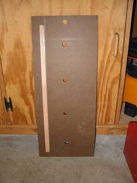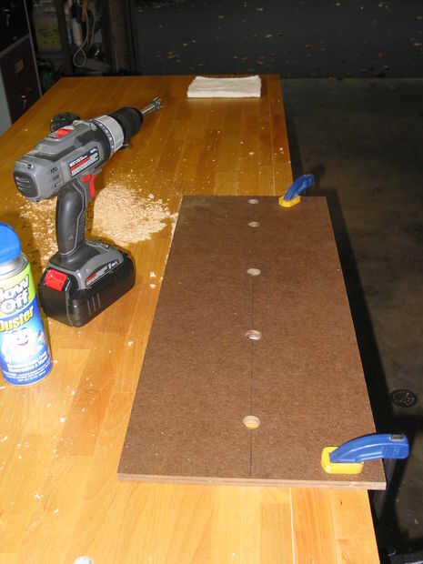 Nota: Una plantilla no es ciertamente una necesidad; seguramente pueden perforar los agujeros del perro sin usar uno. Sin embargo, usando 1/4" madera ayuda a conseguir la broca forstner y taladro en la posición taladrar un agujero perfectamente recto (siempre que hiciste un buen trabajo que hace la plantilla). También ayuda a mantener los agujeros alineados y elimina la necesidad para medir y marcar la posición de cada hoyo individualmente.