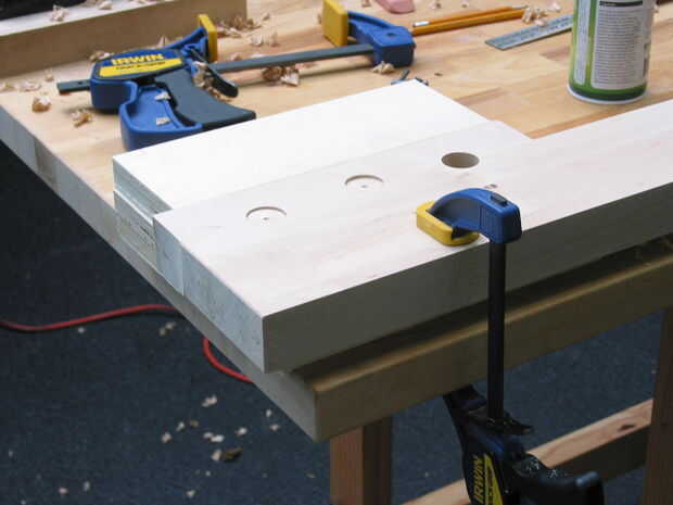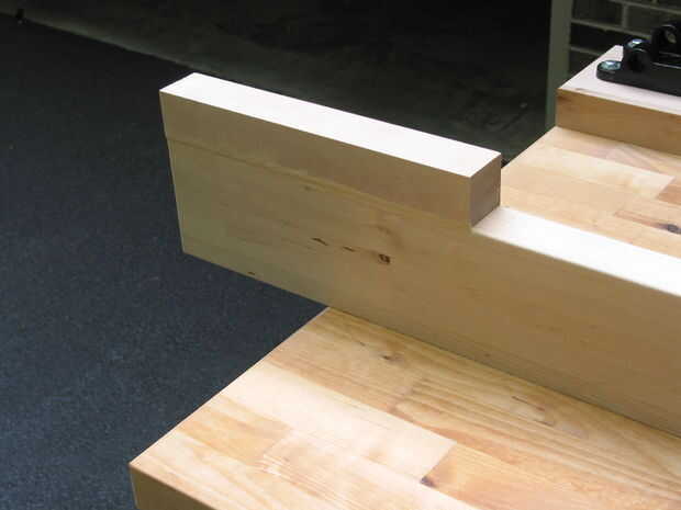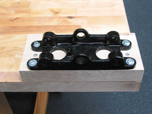 Foto #1: Después de determinar el tamaño de las mordazas, si es necesario, pegar y atornillar un espesor adicional de la madera a la parte inferior delantera izquierda de la parte superior de la mesa de trabajo. A continuación, utilizando los tornillos de tamaño adecuado, garantizar la estructura de tornillo en la parte superior.