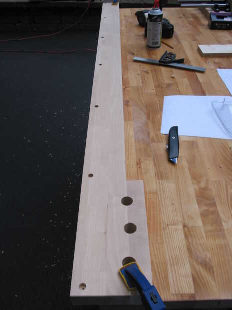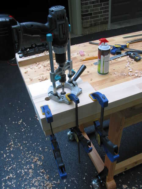 Foto #5: A continuación Taladre los orificios en el delantal de trabajo. Como se ve en la foto, recuerde que un pedazo de desecho debajo del faldón para evitar dañar la superficie de trabajo cuando taladre los orificios (especialmente si usas la parte superior de la mesa de trabajo desató).