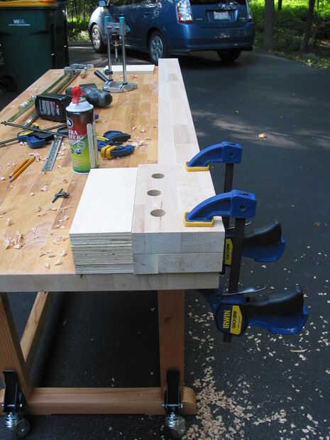 Nota: el tornillo de Banco usted elige para su banco de trabajo influirá en el tamaño de las mordazas y cómo monta en la mesa. La mordaza de Rockler usé necesaria que mi mordazas ser 5 1/2" de alto y 11" de ancho. Ya que mi mesa era sólo 1 1/2" de grosor también tuve que agregar una segunda capa de madera que me dé la superficie de montaje grueso necesario de 3" para el marco de la prensa (Foto #1).