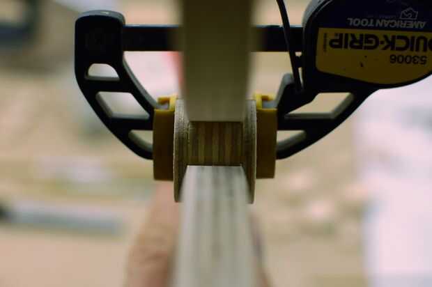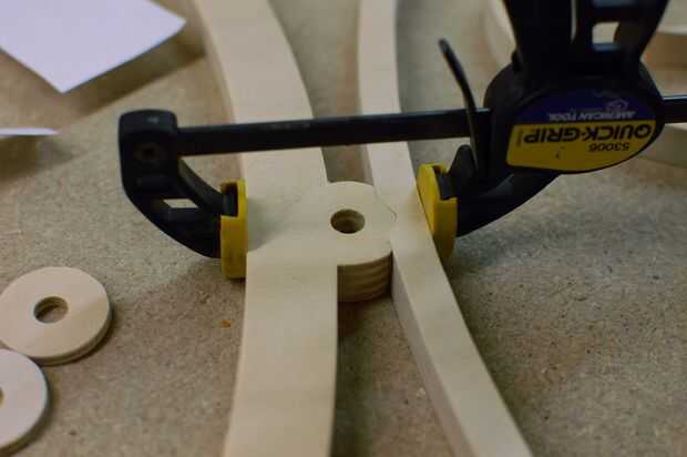 A continuación, deslice el tubo de 9/32" y los dos discos de apoyo. Éstos deben también ser pegar. De nuevo, utilice una abrazadera para sujetar los discos prensados fuertemente contra el brazo flotando y el remate.