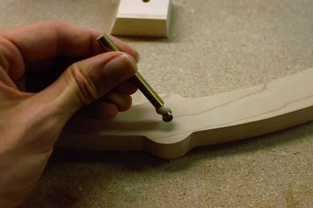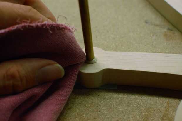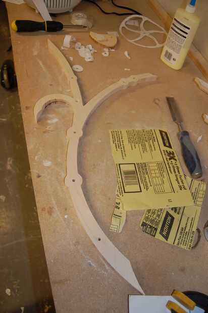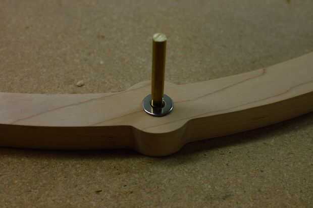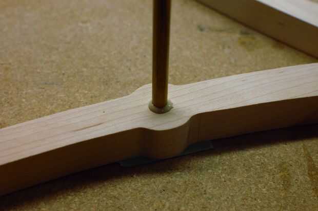 Cuatro varillas de 1/4" conseguirán pegados en el marco. Las cuatro barras (o árboles) se describen en la misma página en el conjunto del patrón, pero asegurarán de que saber cuál es cuál, ya que son todos similares en longitud. Pegue cada uno en su agujero correspondiente, utilizando el diagrama como referencia. La varilla del brazo flotando requiere una pieza de apoyo adicional, péguelo sobre la varilla, asegurándose de que el pequeño agujero es apuntado hacia abajo. Usar mucho pegamento, pero asegúrese de limpiar cualquier exceso que exprime hacia fuera o podría interferir con el funcionamiento de la escultura.