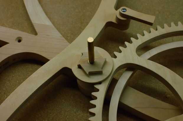 OK, ahora un poco de una parte delicada. Aún acostado su mesa de trabajo será los cinco "clicks". Estas deben instalarse en las cinco clavijas que empareja en la rueda de escape. Se debe instalar frente a la dirección correcta; Consulte el diagrama o cuadro para la referencia. Básicamente, los puntos deben encajar los dientes de la rueda clic cuando gira en una dirección determinada, pero paso sobre los dientes en la otra dirección. Organizar los clicks en un vago círculo, luego baje el conjunto del engranaje de 10T para que la rueda de clic se encuentra rodeado por los clicks. A continuación, deslice la cosa entera en el eje de la rueda de escape.