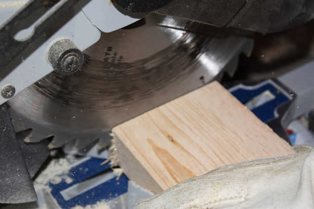 Por último, puse la hoja en la sierra para cortar a 45degrees. Luego coloca un cuadrado debajo de la hoja y cortar dos triángulos.