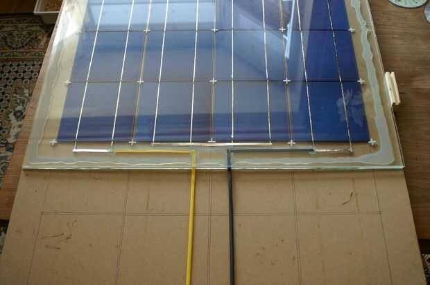 Luego coloqué la otra placa de vidrio en la parte superior para que las células ahora se intercalan entre las 2 hojas de vidrio de 4 mm de espesor (sí que acabo de hacer doble acristalamiento con células solares incrustadas, cuán fácil puede ser un plan).