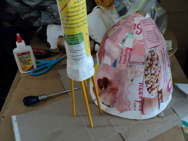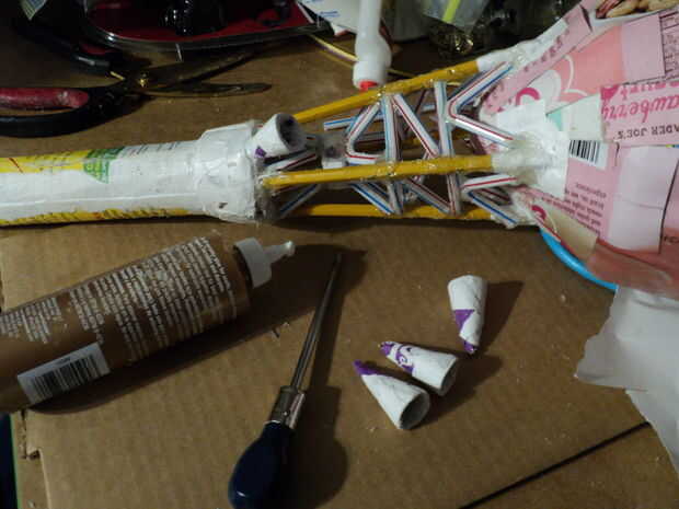 He insertado los lápices en los agujeros perforados con un punzón. Las patas o soportes principales eran pegar. Luego construyó hasta los peldaños de la torre con piezas de corte de pajas de beber y caliente pegado en lugar.