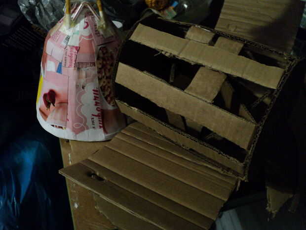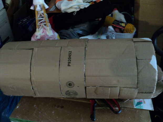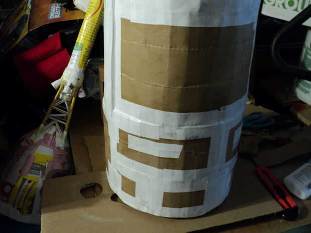 El cartón corrugado la izquierda más grande las costuras y las lagunas que sería cubiertas y alisadas con papel maché. Acaba de aplicar el pegamento directamente en pedazos de papel de escribir. Las costuras irregulares añadir una textura agradable detalle para el cohete.