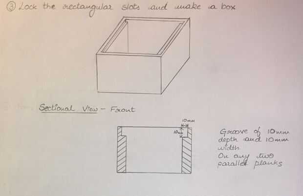 (Nota: prestar atención: he mencionado ranuras rectangulares y surcos. Las ranuras se hacen en los lados de las tablas que se hacen surcos en la superficie superior de solamente en dos tablas paralelas de frente)