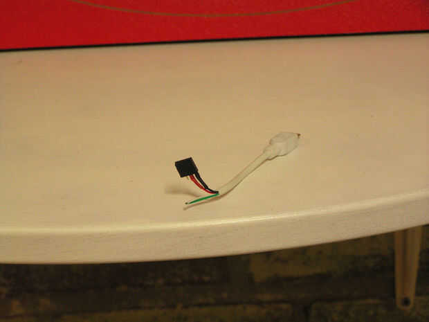 Suelde el cable rojo (5V) al pin medio y soldar el cable negro con el conector a la derecha de él (sí, a la izquierda es también aceptable siempre y cuando se monte el conector correctamente, listillo). Cuando deslice la engarzadora sobre los extremos soldados y encogimiento. Si no tienes ningún listo termo retráctil, una cucharada op hotglue aislar demasiado y buscar ueber-ghetto.