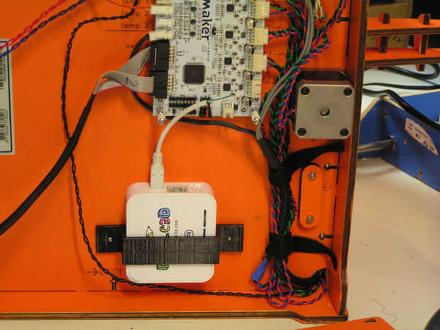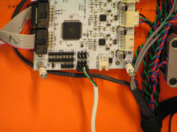 Coloque la impresora sobre su lado izquierdo, interruptor para arriba, quite la cubierta de la electrónica y encender la máquina (ignorar las advertencias, viviendo en el bebé de borde!). Localice el conector ext-io, se encuentra entre conector j28 y ventilador en la parte inferior de la Junta. ¿Con el voltímetro, verificar el pinout de ext-io es como esperar que (puño 5V, tierra, señal de la fila, segunda fila: señal, 5V, tierra), esto coincide con el pinout del conector que acaba de hacer? (nc, 5V, tierra). Cuando todo va bien, la alimentación a la caja de doodle, su luz debe encenderse para indicar que tiene poder. ¿Montarlo con la luz visible, ¿te?