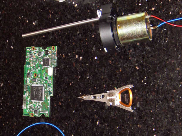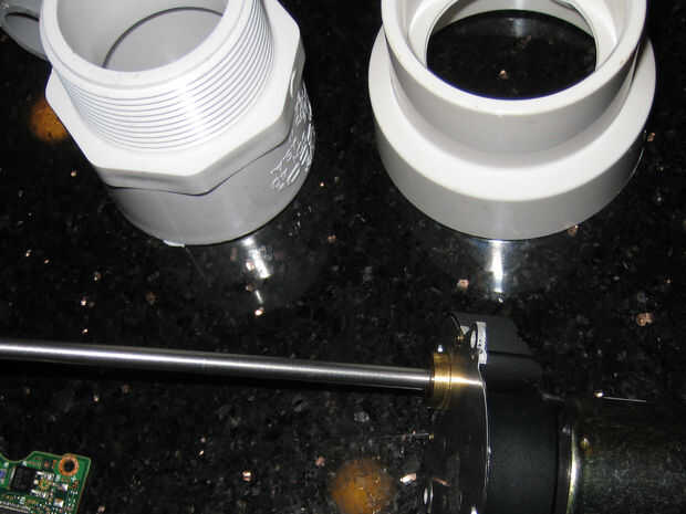 Cada Borg tiene un implante Ocular de uno de sus ojos. Esto es donde el motor reductor. Nos permite pegar algo al final del eje del motor gire y generar algún movimiento para los Borg. Llevar el motor a Home Depot o Lowe y buscar unos accesorios de tubería de PVC que se ajuste en. El objetivo es poder caliente pegamento el motor en uno de ellos y tienen hilos de rosca en el otro extremo para enroscar en la calabaza para sostenerla en lugar. También tenemos que encontrar algo para poner en el extremo del eje del motor. Recuerdo un par episodios donde brocas y cuchillas salieron de Borgs, pero pensé que esos y poco niños podrían no ser una buena idea. Tenía una cabeza de lectura de un disco duro desechado y utilizarla. Atribuimos al final de la Asamblea.