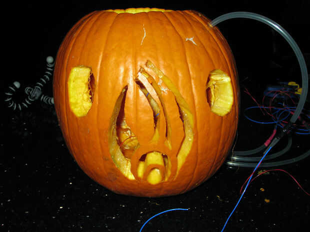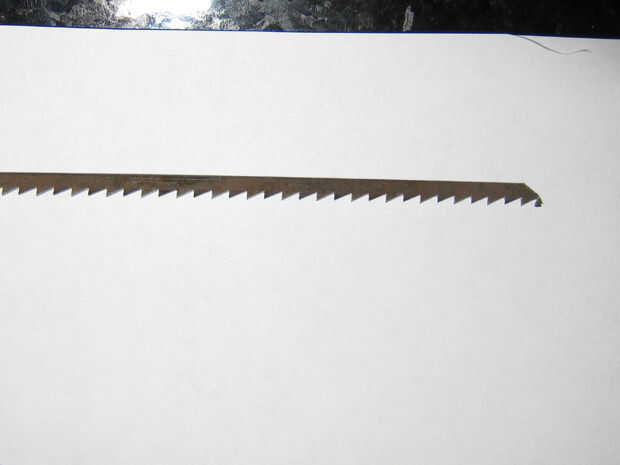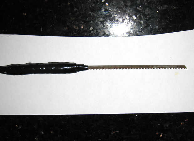 Hice una sierra para tallar la calabaza con corte una hoja de Sierra de marquetería en ángulo con unas tijeras y luego grabar el extremo con cinta aislante para hacer un mango