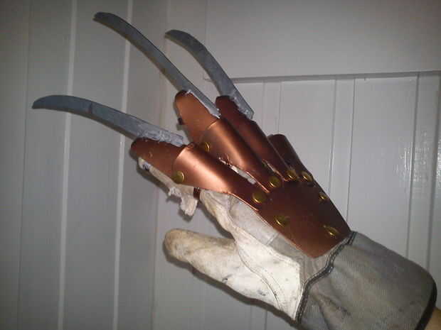 Para terminar esto, los dedos del guante a través de los rizos de pescado y, a continuación, ponga su mano en él. Asegúrese de que la parte de metal gaunlet quede como usted lo desea. Luego utilice un marcador y dibujar un punto por cada uno de los tres orificios no utilizados. Usar algo para golpear hacia fuera los agujeros pequeños en la parte superior del guante y remache el guante a guante. Ya está terminado!