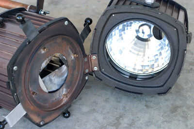 Teatro usado luces a menudo necesitan reparación. Si las lentes y el reflector están intactos, pueden solucionarse problemas más. Persianas deben ser martillado plana o nuevos cortan de una vieja bandeja de aluminio. Lubricar el cañón enfoque y asegúrese de que puede deslizar y trábelo en posición. Para apoyar a la luz, perno de una tubería de cobre de 3/4" con una tapa al yugo. Emplee dos roldanas para evitar que el agujero del tornillo de deformación. La pipa entonces puede colocarse encima de un soporte fuerte de la luz.