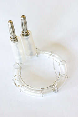Usando guantes, sacar la luz de modelado de su zócalo y póngala a un lado. Saque los dos pernos de plástico en el lado de la luz estroboscópica y sus collares de bloqueo con una lámina de cuchillo. Deslice con cuidado las dos mitades de la luz estroboscópica ligeramente separada. Acceso desde el lado con los alicates de nariz de aguja y suavemente mueva los enchufes de plátano del tubo de flash de las tomas. Mueva uno y luego el otro. Utilice una luz fuerte para que pueda ver lo que está haciendo. Sólo las clavijas son de metal, el resto del tubo es de vidrio. Lento tirando del tubo de la parte superior puede ayudar, pero debe hacerse con mucha precaución. Retire el reflector de metal de la luz estroboscópica cuando el tubo está fuera...