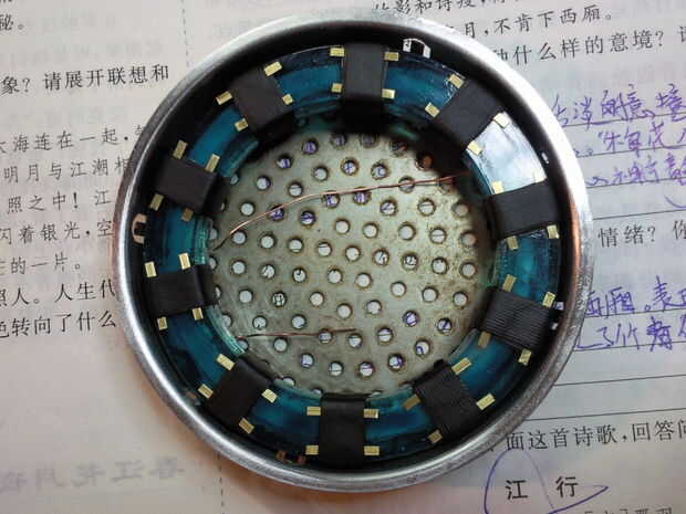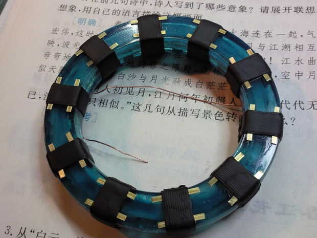 En primer lugar, la cinta de goma en las marcas predefinidas en el anillo de luz del círculo y envolver la placa de cobre en la cinta de goma. Entonces círculo de la cadena de cobre amarillo de la cinta, pegamento de la cadena de latón en la parte posterior.