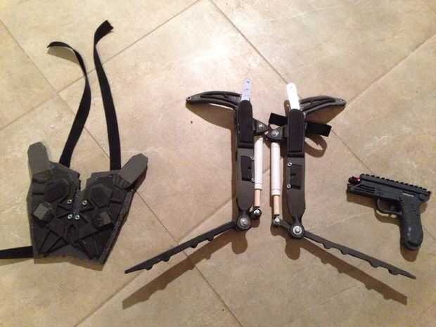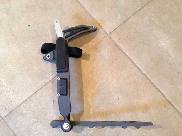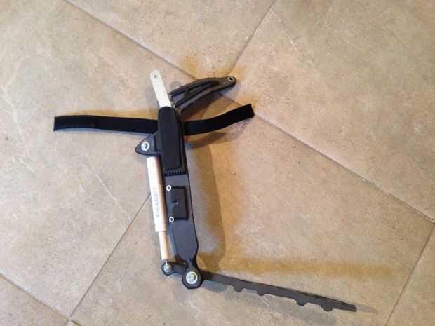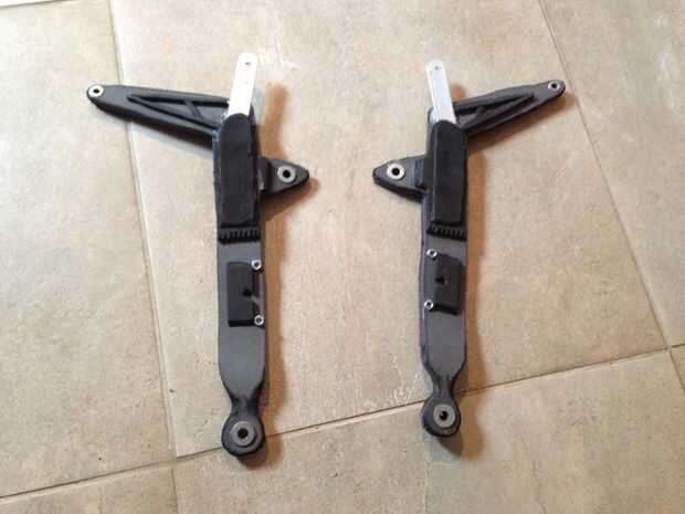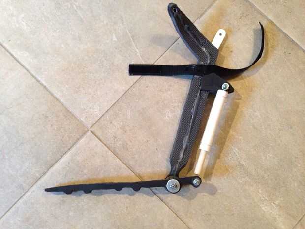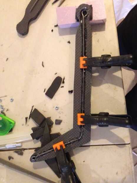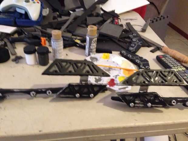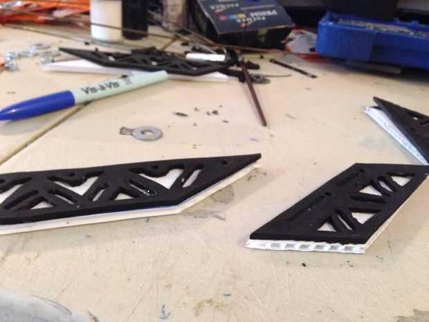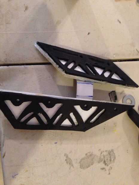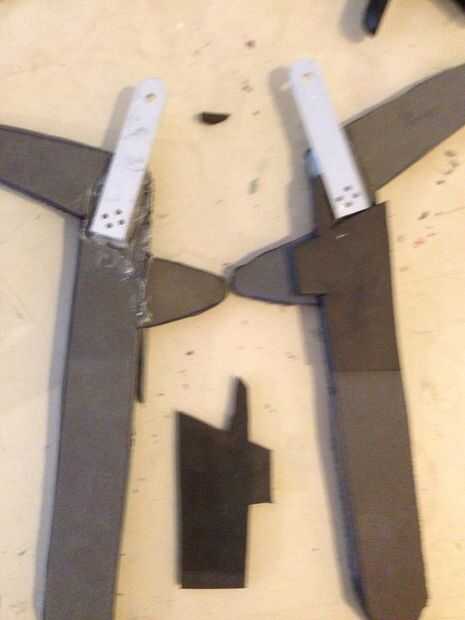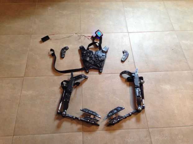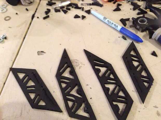 Utilicé el mismo método, corte y fortalecimiento con el alambre, para formar los brazos. Me hice bucles con el hilo para reforzar los agujeros donde se encuentra los puntos. asegurar las uniones con las arandelas, así. También utilicé barra de aluminio grueso para crear la junta superior, como se ve en la foto. También pegué en nueces para darle ese aspecto industrial. Corta y une la delantera brazo protectores de plástico corrugado, atacando con recubrimiento de aluminio. Para los toques finales, cubrió con el plastadip spray, pintura negra y plata en los bordes para que el metal se vean desgastados.
